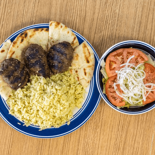 Our own beef patties grilled with fries or rice pilaf or lemon potatoes, side salad, pita bread and tzatziki dip