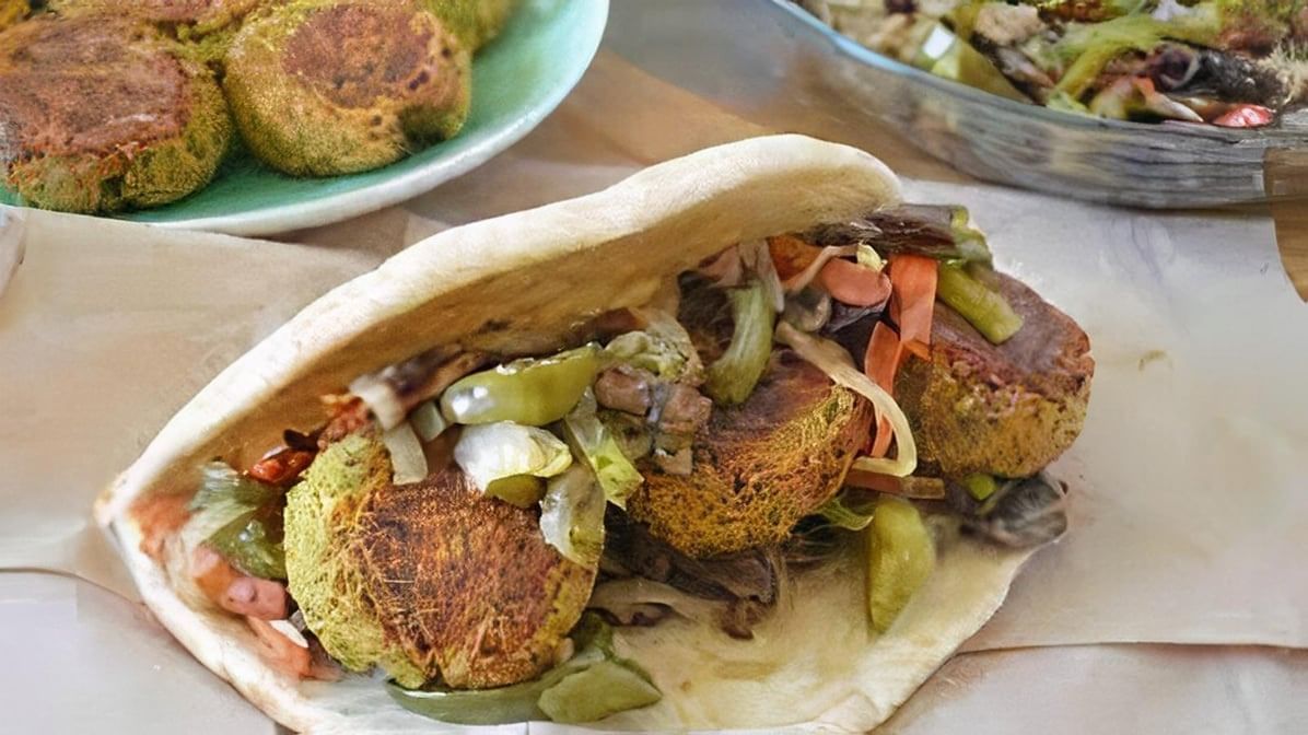 Vegetarian chickpea balls with lettuce onions tomato and tzatziki sauce wrapped in a pita