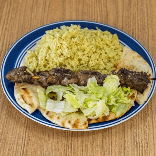 A stick of lamb souvlaki with rice pilaf or fries or lemon potatoes with side salad, pita bread and tzatziki dip. For a second stick add +7.00$