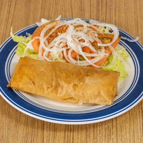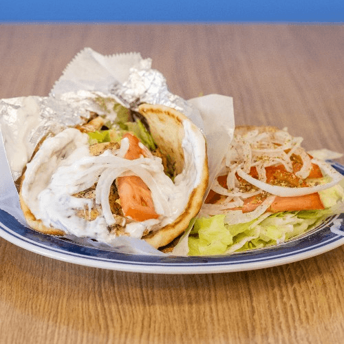 Our own 100% beef patties marinated w Greek herbs /spices (yiayias recipe) with lettuce, onion, tomato, tzatziki sauce wrapped in a pita