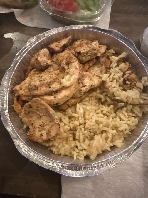 Grilled chicken strips with fries or rice pilaf, side salad, pita bread, tzatziki dip